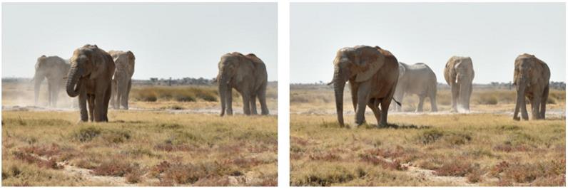 4 Elefantenbullen auf dem Weg zu unserem Auto, zuerst unschlüssig wie sie sich verhalten sollten, da wir auf ihrem Trampelpfad standen. Wir fuhren ein Stückchen weiter und die großen Tiere zogen gemächlich nach einem ausgiebigen Staubbad auf ihrem Pfad hinter unserem Auto davon.